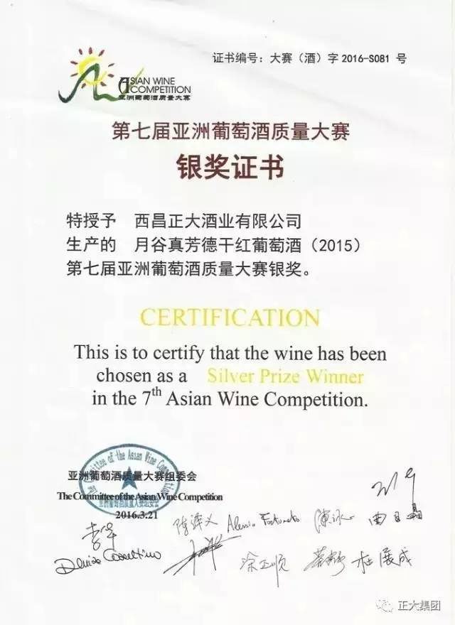 ▲正大酒業(yè)月谷干紅葡萄酒榮獲第七屆亞洲葡萄酒質量大賽銀獎